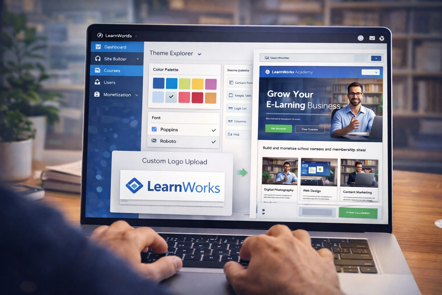 LearnWorlds centers customization around three main areas: the Site Builder for your public-facing school, the Theme Explorer for global styles, and specific editors for courses and players.