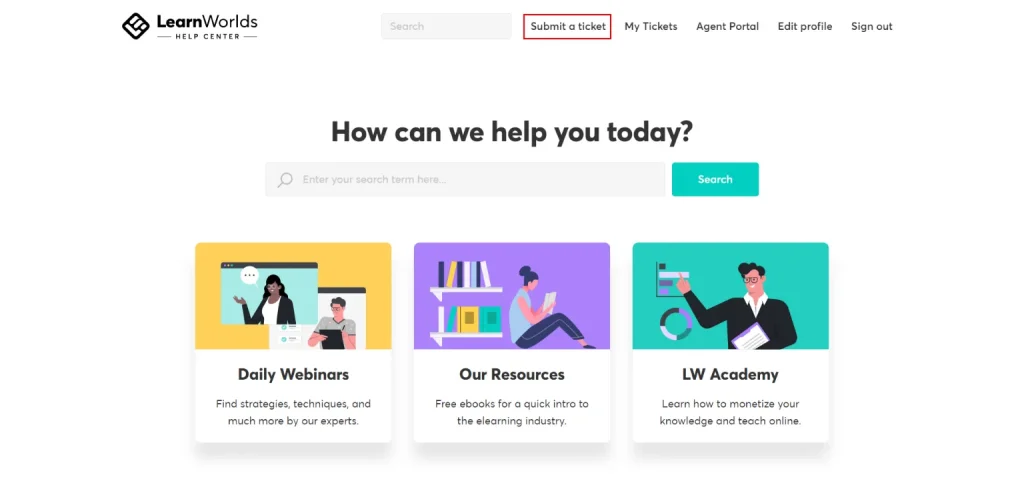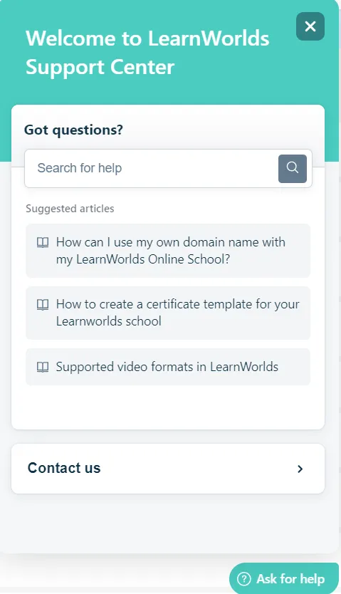 If our articles don’t have information about your inquiry, click on Contact Us to Submit a LearnWorlds support ticket. You can also attach a relevant file, such as a screenshot, or you can also provide more information about your request (the Ask for help button will appear in LearnWorlds schools).